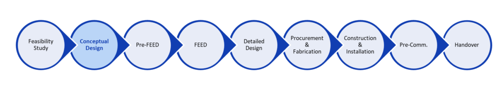 The Conceptual Design stage – sometimes ‘Concept Selection’, ‘Conceptual Engineering’ or ‘FEL-1’ (if FEL project planning is used) – starts after a positive outcome of the Feasibility Study: the project seems technically achievable and commercially viable. This next stage marks the start of the design process, and the three subsequent stages (Pre-FEED, FEED /Front-End Engineering Design, Detailed Design) will each go a level deeper, expanding the design with more details and more accuracy.