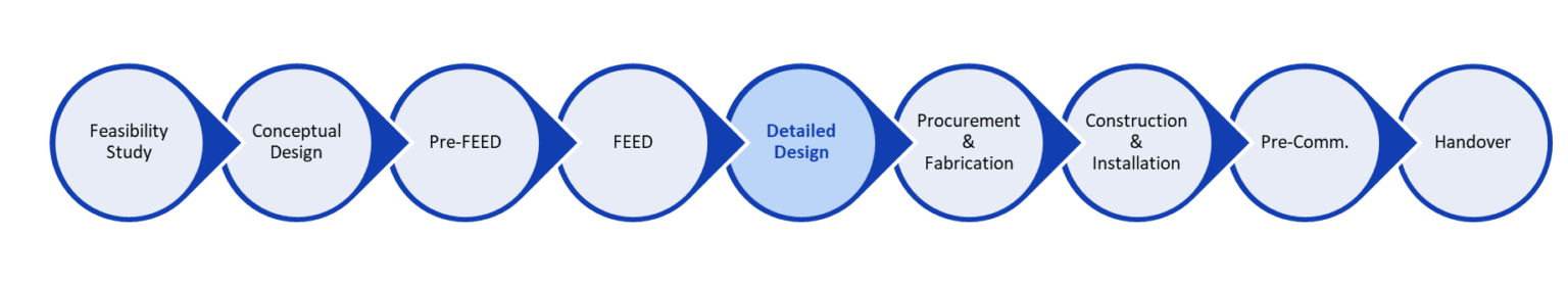 • Based on the “FEED package” from the FEED stage, Detailed Design fills in all design and vendor details, which are required for proceeding with procurement, fabrication, construction and installation.