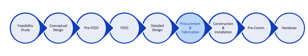 After successful completion of the Detailed Design stage, procurement and fabrication come next. This happens based on the final, approved design documents and “Approved for Construction (AFC)” drawings.